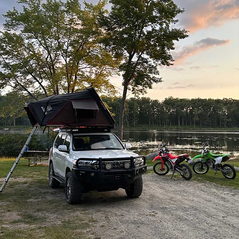 On other occasions it is just my son Joshua and I finding a good basecamp to take our dirtbikes out and explore. Once it ended with a dirt bike coming loose while heading out of the woods and slammed through the back window of the cruiser. Not ideal and a long windy, loud and dusty ride home. Not everything always goes as planned but we roll with it.”